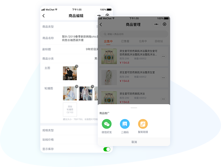 商品推广一键即达,可直接分享微信好友、生成二维码、复制链接